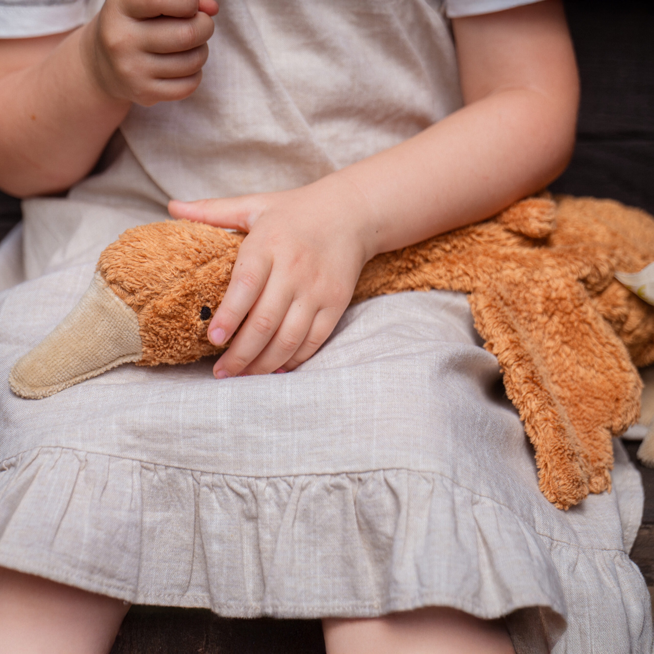Låt oss presentera Senger Naturwelts handgjorda gås i genomgående naturmaterial, tillverkad i 100% ekologisk bomull och stoppad med ekologisk ull. Mjukdjuret kommer med en löstagbar bomullspåse fylld med ekologiskt odlade körsbärskärnor som går att värma eller kyla om man vill. Kan användas för att värma barnet, tillföra värme vid magont, kyla vid feber eller som en extra mysfaktor! Körsbärskärnorna fungerar som ett naturligt alternativ till plastkulor som inte sällan används för att ge lite tyngd i mjukdjuren. Den handgjorda gåsen har broderade ögon, nos och mun och är barnsäker.